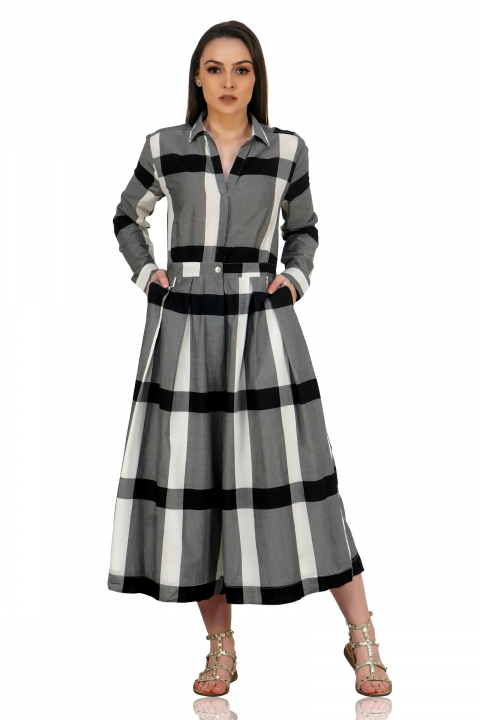 Mid-calf length is for divas. There is nothing more enamoring than a classic jumpsuit in large navy and white check pattern. You won’t have to go nuts looking for the right essentials to go along with it.