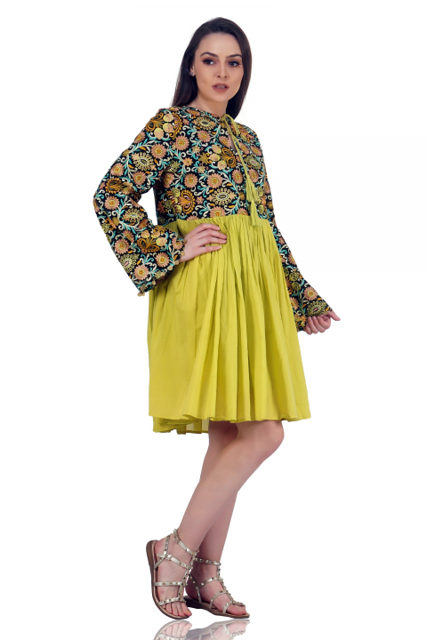 Offering all-day comfort, this sleeveless knee-length wear is a must for winters. The open front, with chocolate brown color, is best for a sober occasion. Style it with a full sleeves sweater to get a fabulous look. It’s another side offers a royal design for fusion occasions.